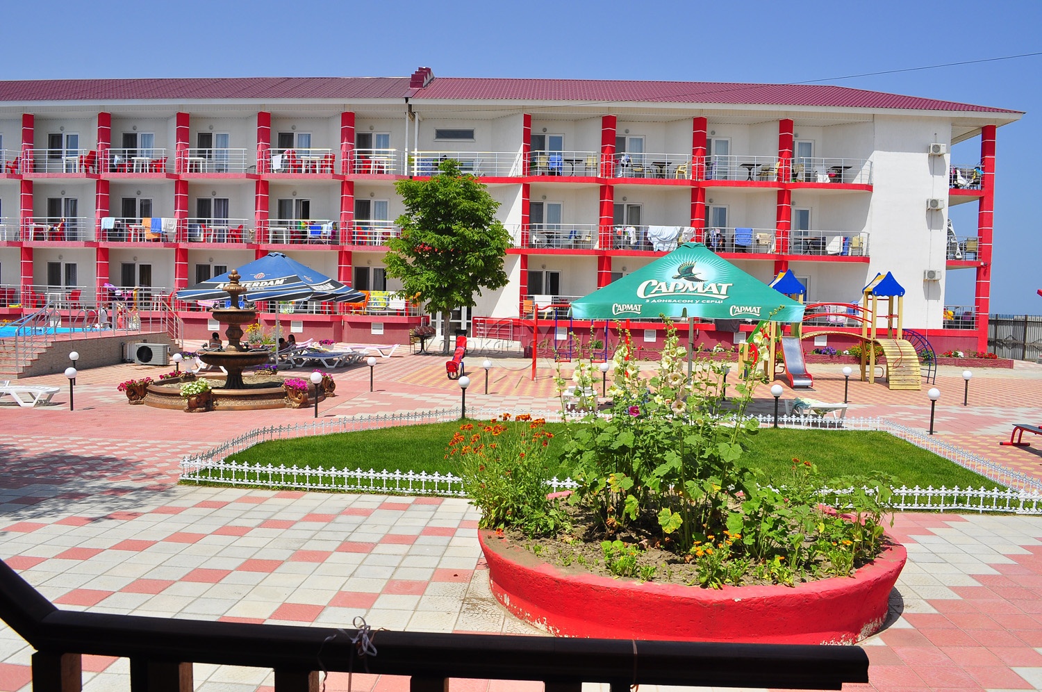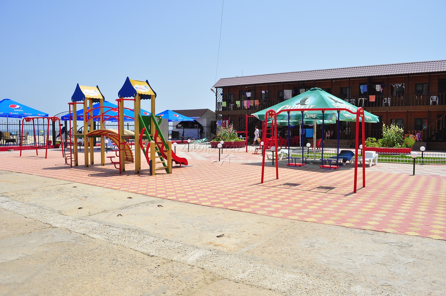 На пляже вы найдете большие горки, скутера, другие водные развлечения, шезлонги, а главное — жаркое солнце и ласковое море, теплый песок.