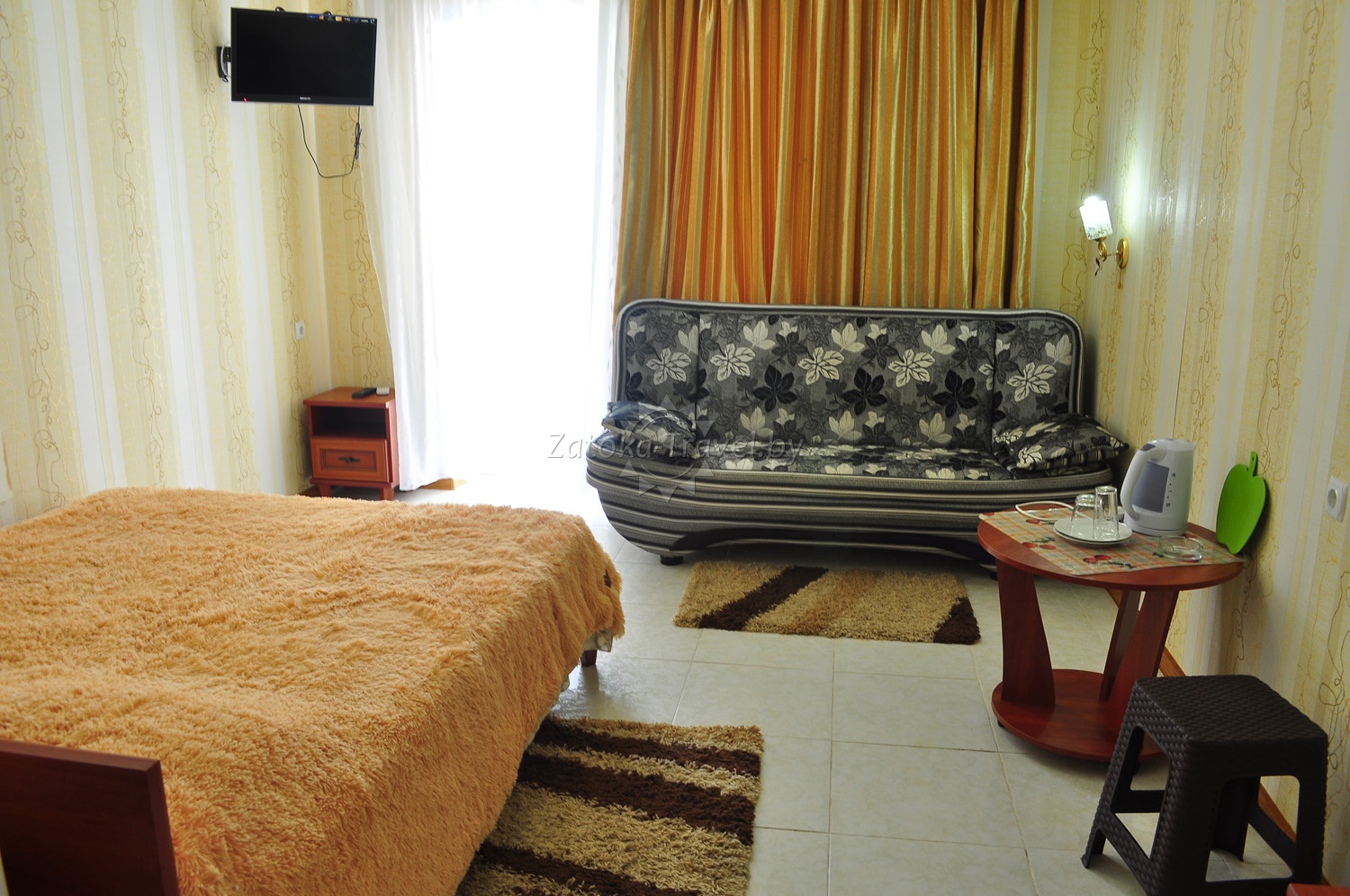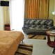 4-х местный: двуспальная кровать, двухместный раскладной диван, кондиционер, ТВ, холодильник, фен, чайник, туалет, душ и балкон.