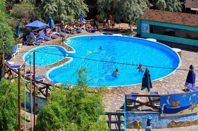 Отель Каролинка в Затоке отличается выгодным расположением: станция Лиманская – средоточие светской жизни курорта. Огромная территория круглосуточно охраняется и постоянно облагораживается: по сути, она представляет собой огромный парк, изобилующий роскошной южной растительностью. На ней нашлось место для детских площадок, уютных беседок и огромного бассейна, напоминающего лазурную лагуну, окруженную зонтами и шезлонгами. В нем есть и детская секция, отделенная от «глубоководной» взрослой.