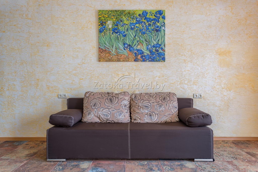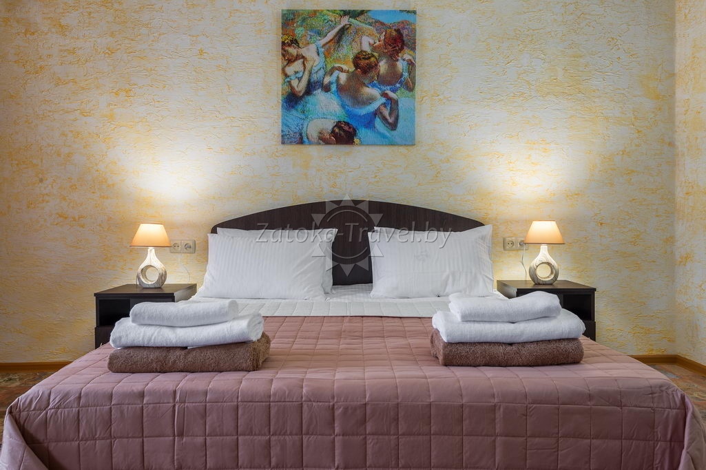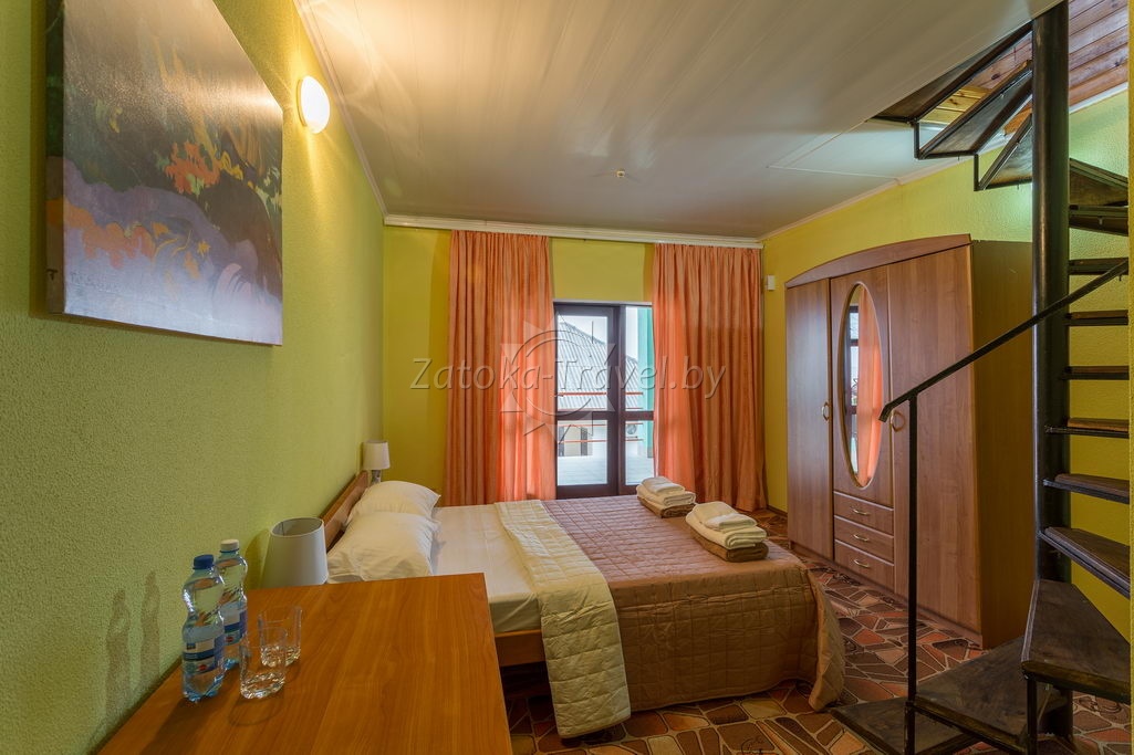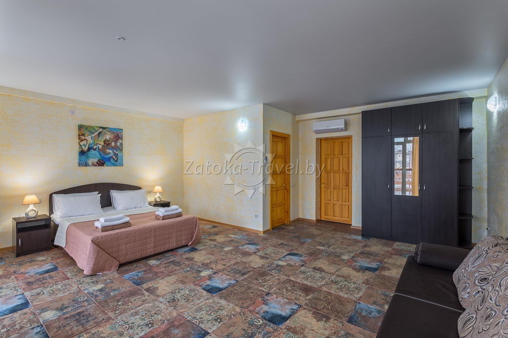 4-хместный люкс с балконом: 40м2, двуспальная кровать, раскладной 2–хместный диван, душ, туалет, холодильник, телевизор, кондиционер, электрочайник, балкон.
