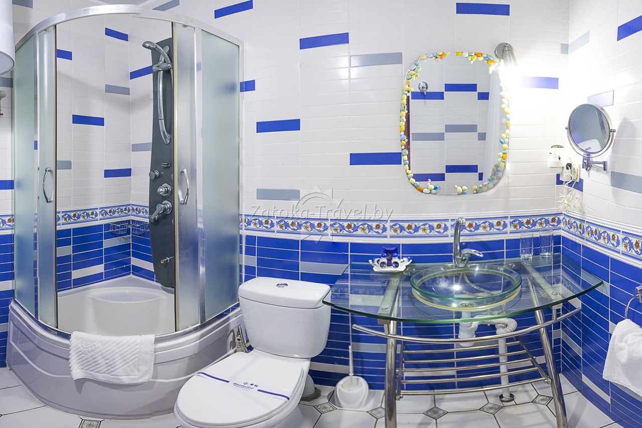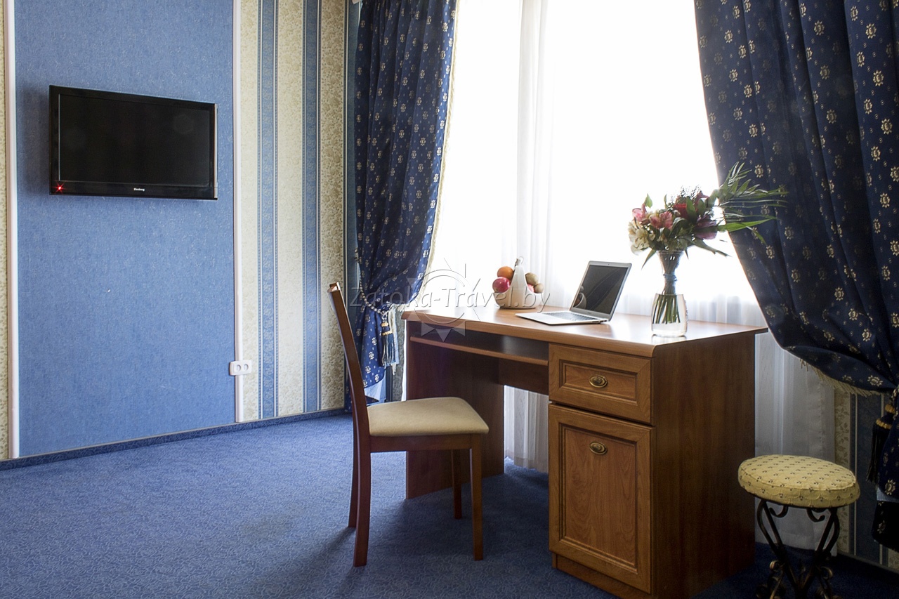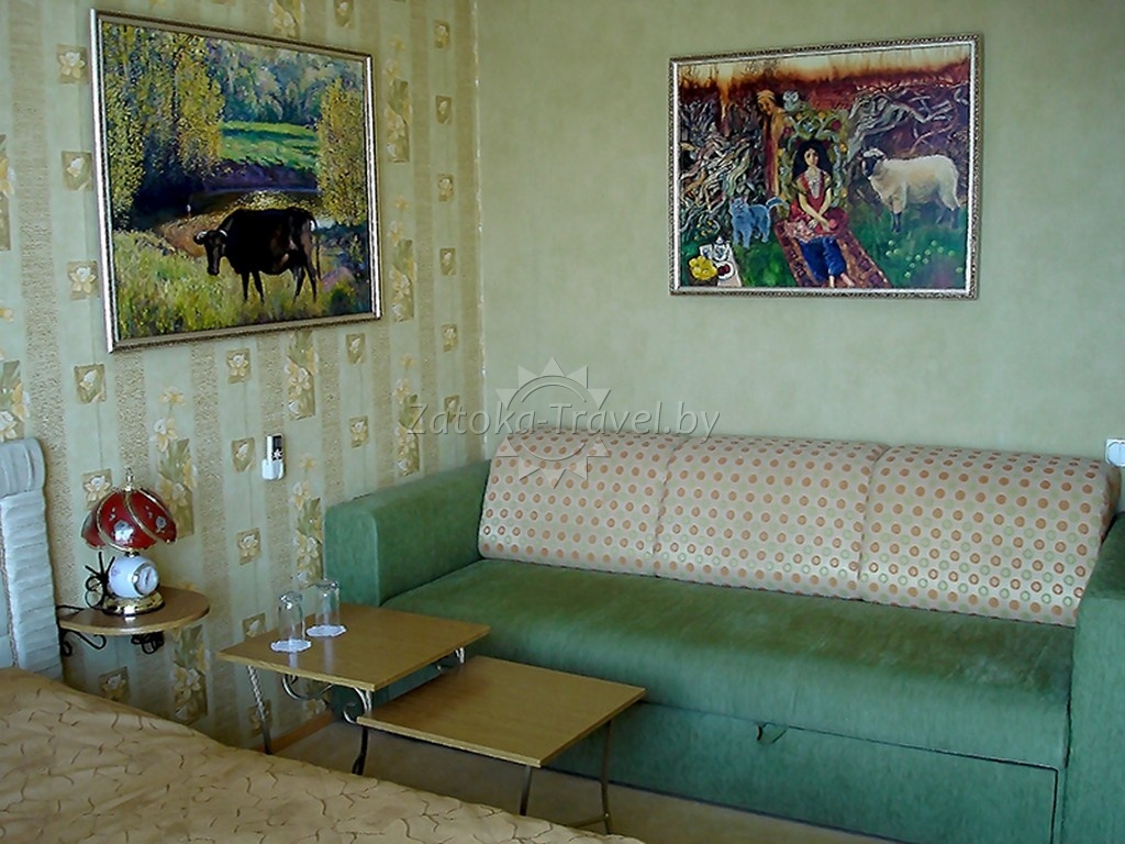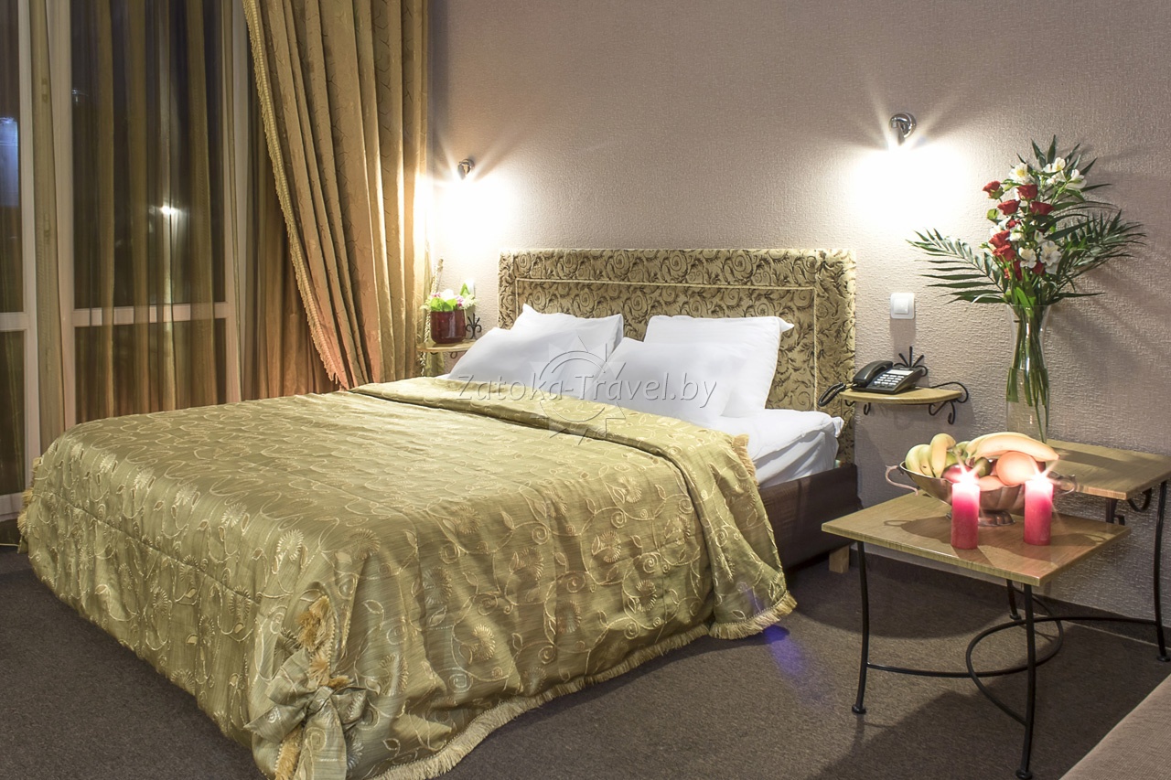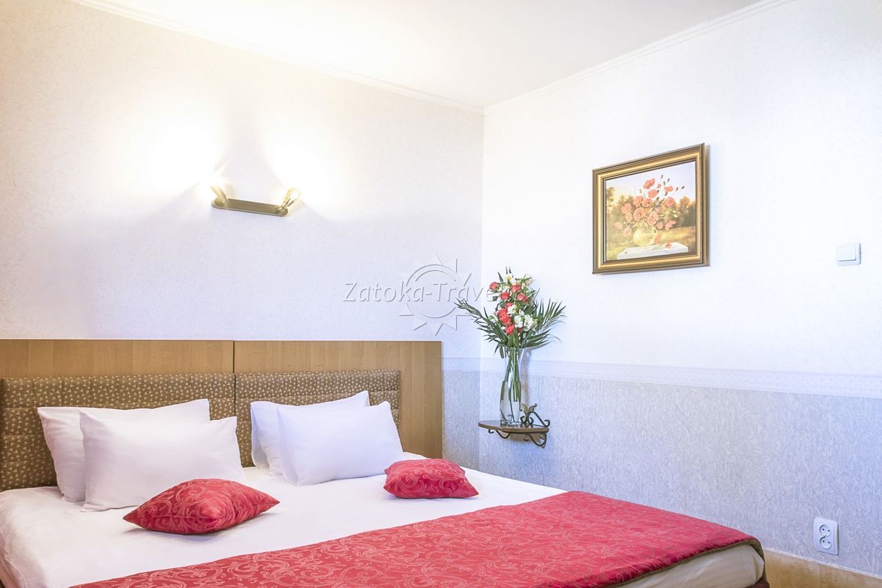 2-комнатный "ЛЮКС": двуспальная кровать или две полуторные кровати, двуспальный диван, кондиционер, холодильник, TV, санузел с ванной комнатой, сейф, телефон. Комфортно могут разместится до 4 взрослых гостей, либо семьи с одним взрослым ребенком и одним инфантом.