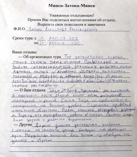 Тур организован хорошо, можно сказать даже отлично. Приветливые и веселые сопровождающие, отличные водители, опытные. Автобус чистый и аккуратный, удобный. База отдыха Приморье расположена в хорошем месте, рядом много кафе, ресторанов, магазинов и рынков. Сама база по сравнению с соседними на высшем уровне. Персонал приветлив и частично общителен. Пляж отличный, оборудован дорожкой к берегу, есть переодевалка, навесы от солнца. Однако море было грязное с зелеными водорослями.
