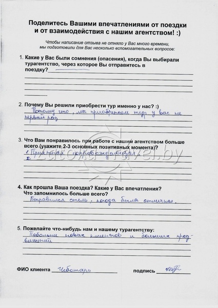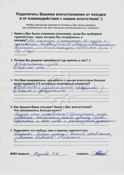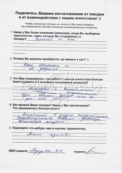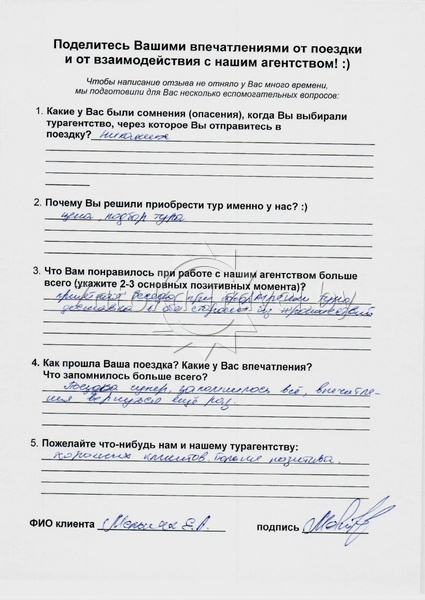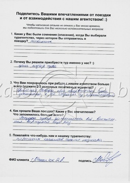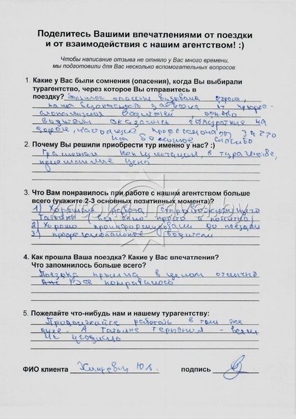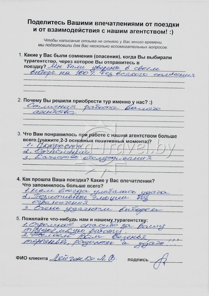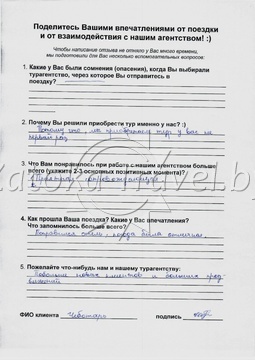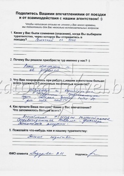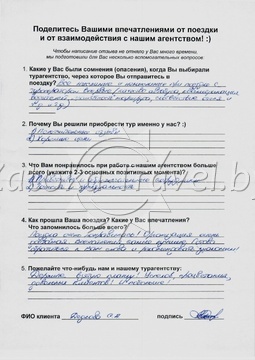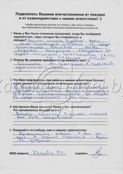 Поездка очень понравилась! Организация очень достойная. Впечатления самые лучшие. Готова обратиться к Вам снова и рекомендовать знакомым! При работе с вашим агентством понравились приветливые и доброжелательные сотрудники, точность и пунктуальность. Держите взятую планку! Успехов, процветания, довольных клиентов!