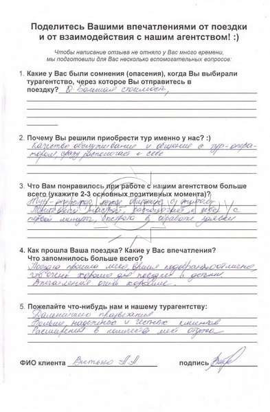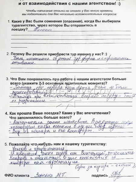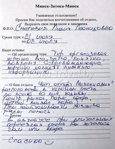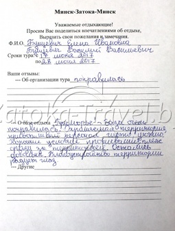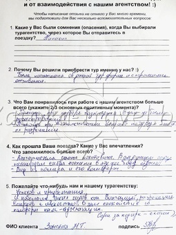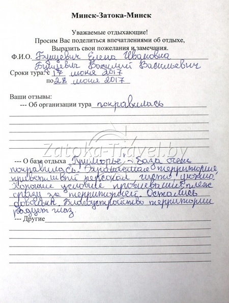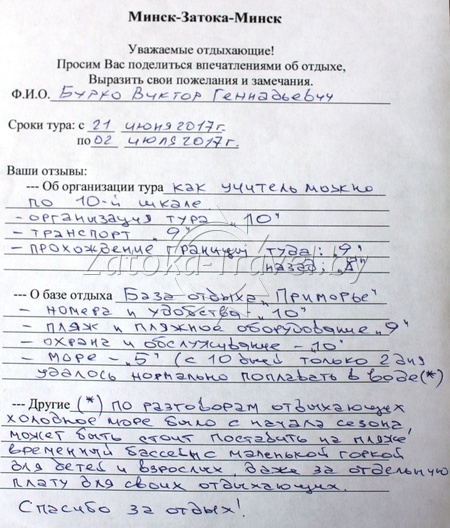 Это была моя первая поездка на отдых.Компанию Затока Тревел нашел в интернете. После того как прочитал отзывы решил позвонить и по телефону мне все понятно объяснили и подобрали тур. Первый раз ехал на такое большое расстояние на автобусе, но все было отлично, даже ребенок не очень устал. На отдыхе порадовало все, отрицательных моментов не было. Большое Вам спасибо за отдых и удачи!
